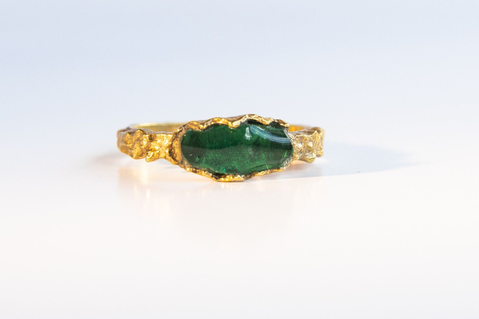 Inspired by the raw beauty and ruggedness of natural landscapes, this Wild Green Onyx ring is crafted with a textured 24K Gold-filled finish. The organic design captures the essence of nature's wild edges, offering a striking blend of elegance and earthy allure.